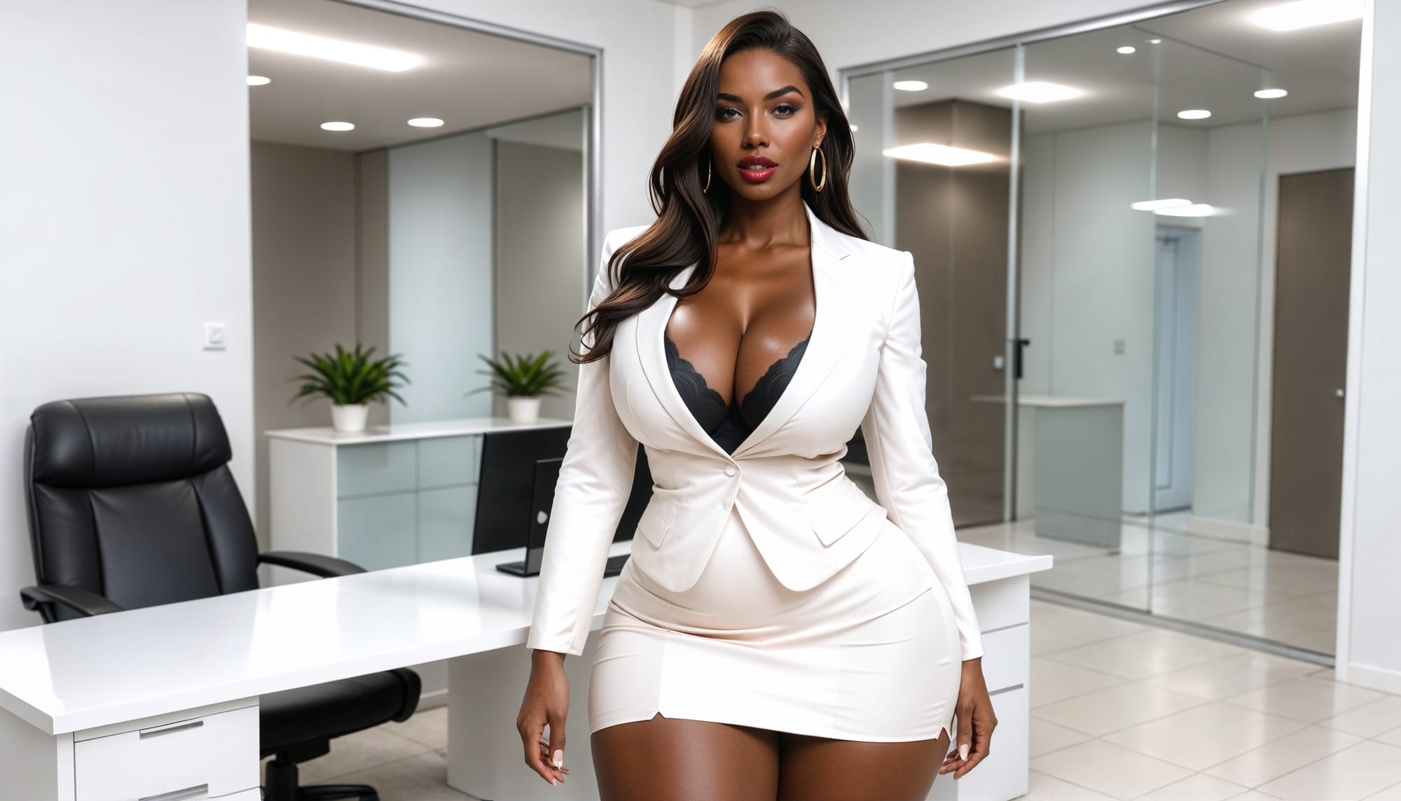 “So this is the leash-holder?” Melanie smirks, eyebrows practically doing a dance. “You’ve kept her busy, huh? Not like she’s going anywhere now. Honestly, she looks ready to burst. Time to dial it up, remind her who’s queen around here. But hey—let’s call this round, yeah? Give her a breather. I want a word before I dip.”